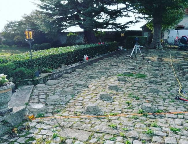 Avant notre venue pour la réalisation du projet, cette terrasse était en pavé d’époque donc sur un sol stable mais irrégulier. Nous avons choisi pour cette conception de terrasse d’utiliser des plots en bétons réalisés sur place à la bétonnière et mis à niveau à l’aide d’un laser rotatif.