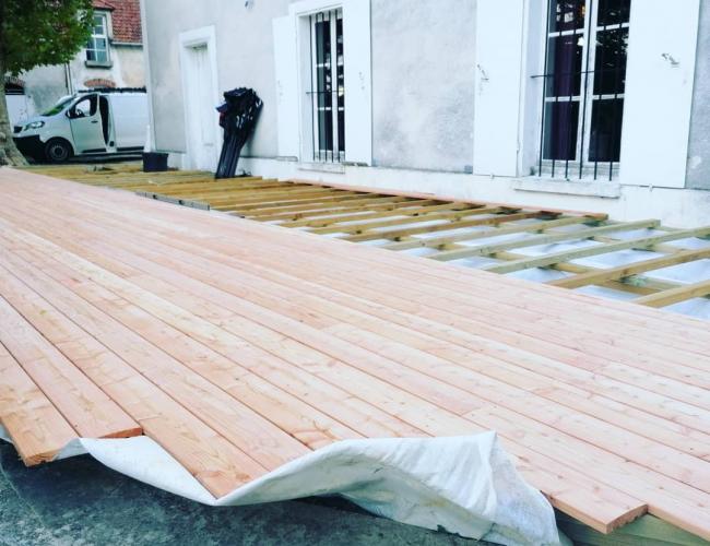 La première étape consiste à fixer des rangées de lambourdes sur les plots bétons précédemment réalisés avec une entraxe d’environ un mètre. Ensuite le second lambourdage vient sur le premier mais celui-ci sera fixé par des vis inox 6x80 avec des entraxes réguliers tous les 50 cm.